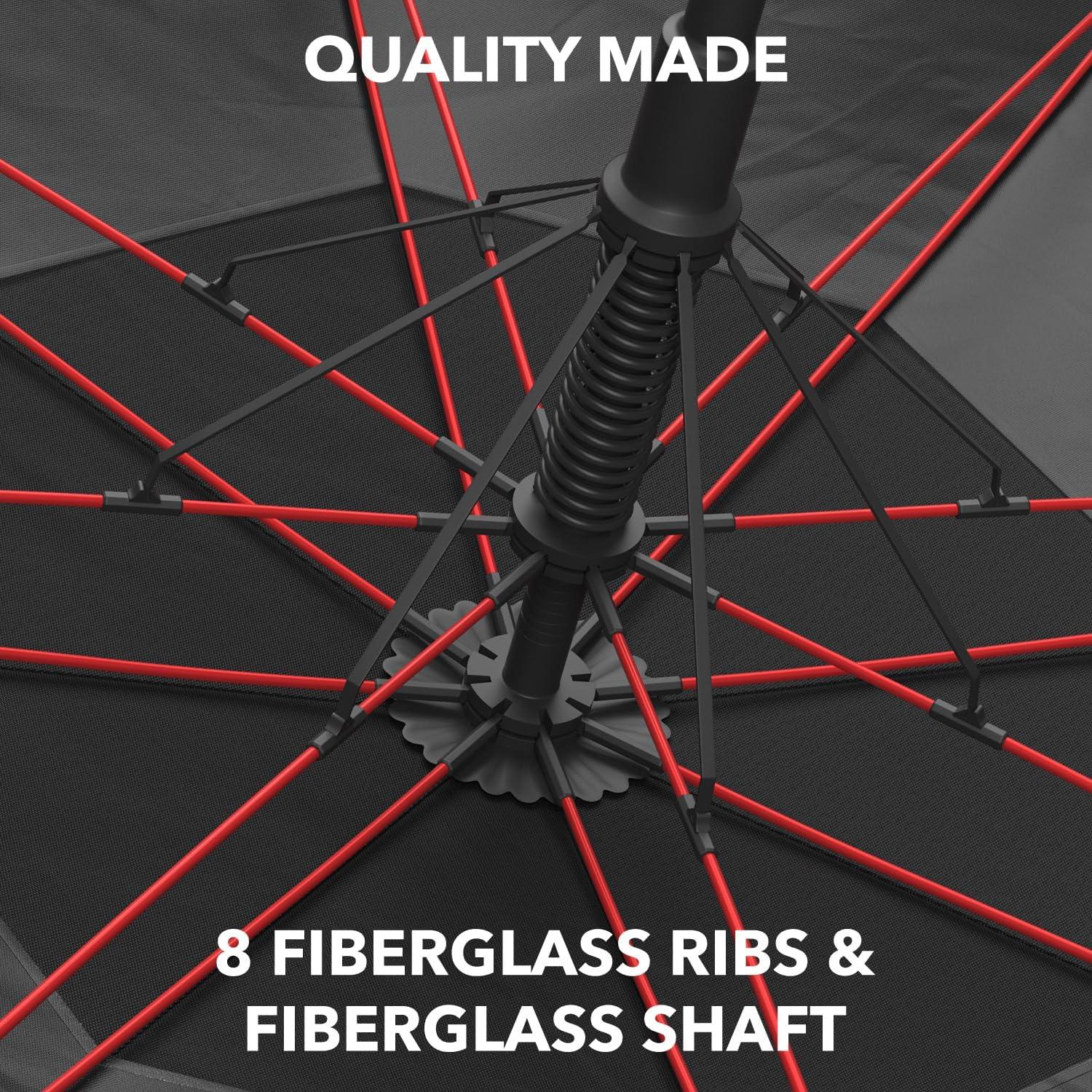 Repel Golf Umbrella, designed to provide unmatched protection and durability in any weather condition. Featuring a 60 inch Teflon coated canopy, this umbrella effortlessly repels rain, snow, dirt, and UV rays, ensuring you stay dry and comfortable. The double vented mesh canopy allows wind to pass through, preventing inversion even during the strongest gusts, while the 8 heavy duty fiberglass ribs provide exceptional stability and resilience. The reinforced fiberglass frame, coated in a striking red paint and equipped with UV technology, ensures long lasting performance and superior protection from the elements, making it perfect for outdoor enthusiasts. Experience the ultimate convenience and style with our Golf Umbrella's ergonomic design and user friendly features. The auto open button allows for instant coverage with a single touch, while the ergonomic rubberized handle with an elastic wrist strap ensures a comfortable and secure grip. Measuring 51 inches wide and 45.5 inches tall, and weighing only 1.77 pounds, this lightweight umbrella is easy to carry and transport. It even comes with a carrying bag and strap for added portability. Whether you're on the golf course or navigating through a busy city, our Golf Umbrella combines functionality, durability, and style to keep you protected and looking great.